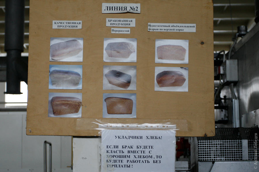 Тут еще сохранилась печь 1958 года. Ну и пол последний раз мыли примерно тогда же. ![]() Специальный аппарат нашмякивает тесто в буханочные формы. ![]() И дальше процесс идет примерно как был описан выше. Бородинский, кстати, посыпают сверху кориандром вручную. ![]() Белый тут тоже делают. Трудовые будни: конвейер встал, а лента из печи продолжает поставлять батоны. Рабочие вскочили разрулить пробку. ![]() Разумеется, тут есть и высокотехнологичные линии. ![]() Хлеб развозят по магазинам в течение всего дня. ![]() Водитель грузовика выложил надпись из булочных этикеток. ![]() Водителей не очень любят на заводе, так как они при первой же возможности стараются украсть лоток-другой, чтобы заработать на перепродаже. Поэтому их не пускают туда, где хлеб еще не оформлен на отгрузку. ![]() Производство в РязаниНа карте мираТут все почти как в Москве. Только еще есть линия, где вместо пальцев специальные штыри в хлебе делают дырки. ![]() За качество тут борются эффективными методами. ![]() Бонус-трек: русский интерфейсПроизводство гречки. ![]() Производство муки. ![]() На элеваторе. ![]() Русский интерфейс это тонкая настройка никому неизвестных параметров. ![]() |