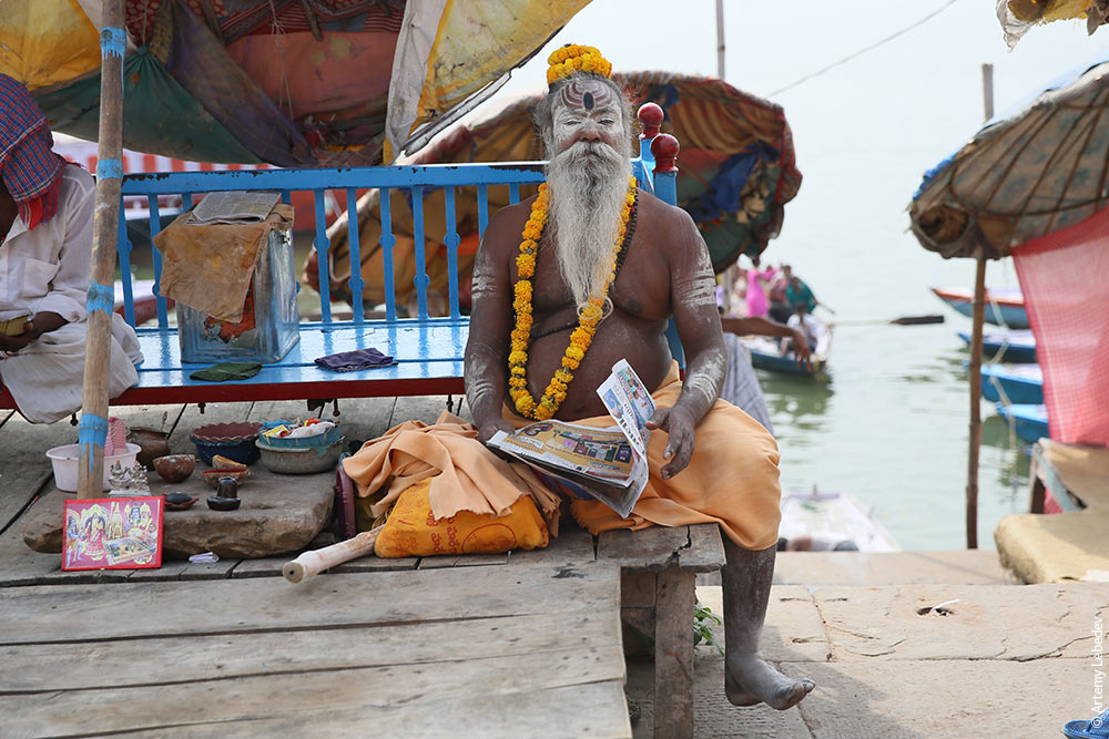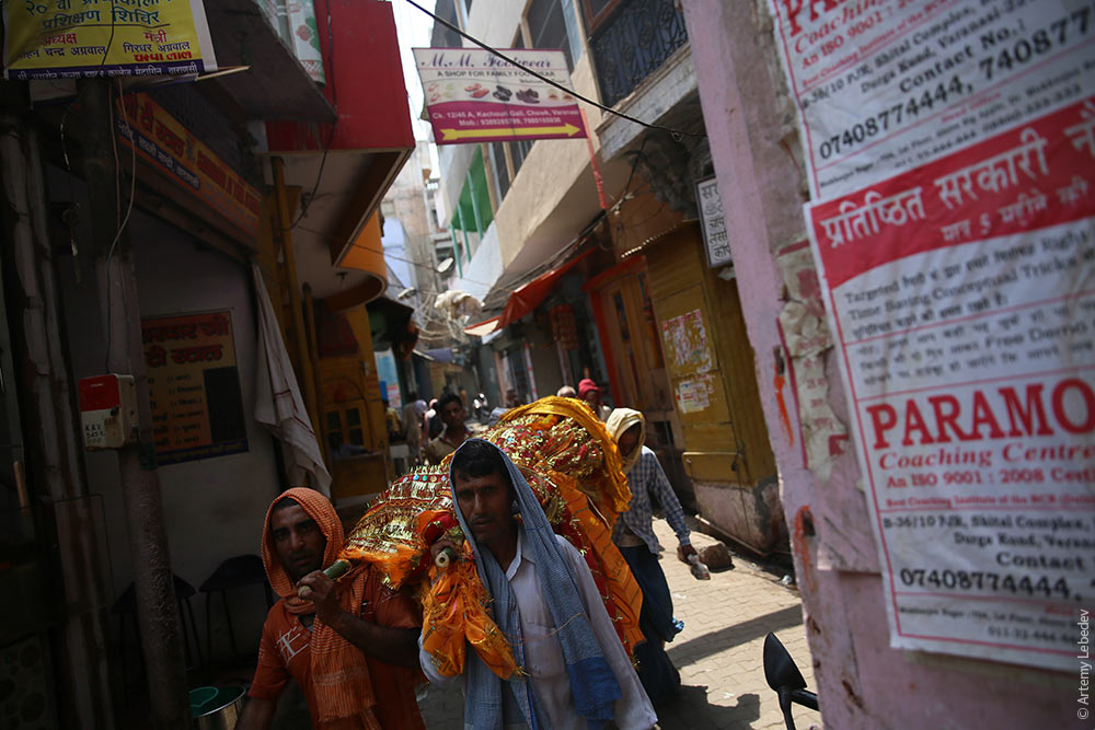 Прилетели в Варанаси. Большой, шумный, людный город. Половина трафика — велорикши. Жарко и душно. Мы стоим и ждем, когда за нами придет мужик из гестхауса, чтобы проводить нас по непроездным улочкам. ![]() И тут началось. Издалека проспекта под стук барабанов медленно шла совершенно сюрреалистическая процессия. ![]() Впереди каждой шеренги ехал грузовой велосипед с генератором, от него провода шли к колонне людей, на головах у которых торшеры и люстры. ![]() Оказывается, это свадьба. ![]() В конце процессии на белой лошади ехал жених. Над его головой держат зонтик. Правее жениха виден памятник, у которого тоже есть зонтик. Потому что зонтик в Индии — это круто. Только у важных людей он есть. ![]() Тут приходят шесть мужчин, которые свивают на головах гнезда из платков, хватают наши чемоданы, кладут их на головы и быстрой вереницей уходят вглубь пешеходных кварталов. ![]() Улицы полны коров, собак, обезьян и еще коров. ![]() Даже после такой небольшой пробежки приятно принять душ. Что хорошо в Индии — почти всегда можно сидеть в это время на унитазе. Неожиданное сочетание, скажу я вам. ![]() Вид из окна гестхауса. ![]() Варанаси — древнейший и святейший город в Индии. Он один стоит половины страны. Сюда по традиции приезжают, чтобы умереть. Или привозят покойника, чтобы тут кремировать. По сто пятьдесят тел в сутки кремируют! Считается, что если душа измучилась, и не хочет больше реинкарнироваться, то ей самое время приехать в Варанаси, чтобы тут твое тело или твой прах отпустили по водам Ганга. То есть, Варанаси это город — стоп-кран. После погребения здесь не будет больше никаких перерождений. Цветочные композиции для покойничков. Настенная реклама. «Краше в гроб кладут», — подумал я. Но тут нет гробов, тут кладут в поленницу. ![]() С такой же скоростью, как только что сюда принесли наши чемоданы, в сторону набережной постоянно несут трупы. ![]() Тут есть несколько важных профессий. Одна из них — продавец дров. Вот он спит среди товара. Продавец такой же старый и сухой, как и его товар. ![]() Товара много. Он занимает все свободное пространство. ![]() Покойничка приносят в цветной фольге, которую перед укладкой на поленья снимают. На одну кремацию уходит три кубометра дров. Тело сгорает за три часа. Стоит такая услуга 10 000 рупий (~150 $). Много, не все себе могут позволить. ![]() Тела на набережной здесь сжигают 24 часа в сутки, 365 дней в году, сто лет в каждом веке, много миллениумов подряд. ![]() Варанаси — это живой портал в прошлое. Ничего более крутого, завораживающего, настоящего, вечного и фантастического, поражающего и пробирающего я никогда ни в одном месте не видел. Вавилон и Пальмира, Рим и Лептис Магна, пирамиды Египта и Мексики — все это туристическая мумифицированная ерунда по сравнению с непрерывным и живым циклом жизни и смерти в Варанаси. И еще тут жарко. ![]() — Рам нам сатья хэ! Рам нам сатья хэ! Рам нам сатья хэ! Если сохранять размер, это можно перевести так: «Рамы имя правда есть! Рамы имя правда есть!». Смысл мантры в том, что «правда», она же истина, она же дыхание, она же дух, больше не является частью тела. Мертвое тело не представляет ценности, поэтому его надо сжечь как можно скорее. Только Рама есть истина, остальное — тлен и прах. Лучше всего тлен и прах получаются при помощи костра. Выкрикивая эту мантру энергично проходят носильщики с новым трупом, завернутым в цветную