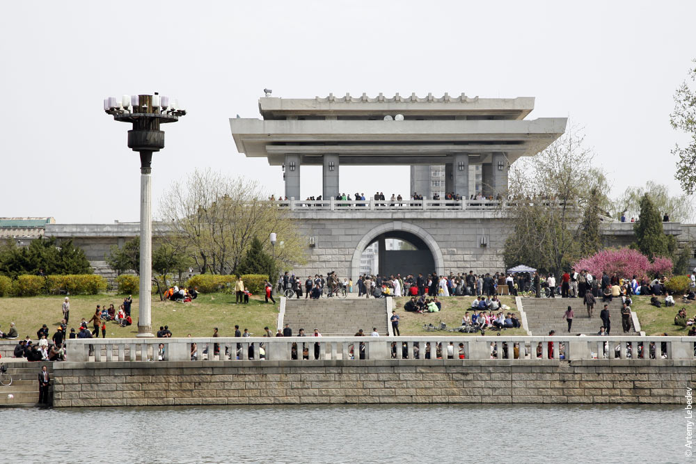 Выходить из гостиницы нельзя. Не может быть и речи о том, чтобы погулять по городу. Маршрут составлен заранее — каждый день несколько достопримечательностей. Выезд около 8 утра, достопримечательность, обед около 12, вторая-третья достопримечательность, возврат в гостиницу к ![]() Все, что может увидеть иностранец, тщательно продумано заранее. Если обед в городе, то ресторан будет в таком месте, откуда никакой городской жизни не видно — только заборчик, зелень, горы и пр. Принимающую сторону очень волнует впечатление, которое останется у туриста от посещения страны. Нужно развеять все мифы о том, как в Северной Корее все плохо. В Пхеньянской гостинице телевизор показывает BBC, пару китайских каналов и НТВ — не пожалуешься на ограничение свободы СМИ. Кормят сытно — не пожалуешься на голод. Аналогом нашего выражения «в переходе» тут является «под мостом». Под мостами происходит основная жизнь. Там частники продают сигареты и какую-то еду, там стоят нищие. Если в столице под мостом еще довольно прилично, то в сельской местности народу там собирается как на вокзале. Заметил я это совершенно случайно, когда дорога искривилась, обнаружив картину, которую обычно не видно с дороги совсем. В Пхеньянских парках встречаются пожилые женщины, которые собирают в парках какую-то траву в полиэтиленовые пакеты. Они не похожи на отряды пионеров, выдергивающих сорняки вдоль шоссе. Гид объяснила, что «они собирают траву для кроликов дома». Один раз я попытался свернуть с проверенной тропы, ускорил шаг, чтобы гиды отстали, и свернул вглубь квартала жилых зданий. Не успел пройти и двадцати метров, как дорогу мне преградил сексот на велосипеде и объяснил — дорога вон там, а сюда идти нельзя. ![]() Во всех местах остановок иностранцев (например, в чайной по дороге в другой город) находятся Березки-Торгсины с «привычными» товарами: китайский спрайт, японский холодный кофе в банках, пиво, сникерсы, сигареты и т. п. В одной из таких лавок на берегу Японского моря обнаружились даже две пачки чипсов Lay’s, срок годности которых закончился в 2001 году. ![]() Не знаю, как покупают корейцы, в Торгсинах принцип торговли следующий: выбираешь товар, продавец выписывает чек, с чеком идешь в кассу с щелями, куда не пролезает рука, платишь валютой (берут евро, доллары или юани), кассир штампует чек, отрывает половину. Ты с этой половиной идешь к продавцу и забираешь покупку. ![]() Доступная для наблюдения уличная торговля скромнее. В основном, это лимонад. Иностранцам выдают одноразовые стаканчики, сограждане довольствуются фарфоровыми кружками, которые моются после использования в ведре или тазу (нет иллюзии подключенного водопровода, которая создавалась в автомате с газировкой в свое время). В местах, где иностранцев не ожидают, в наличии только кружки. ![]() Иногда продают какой-нибудь овощ. Ни в один обычный магазин зайти не удалось, потому что остановок по требованию у туриста не бывает. На этом снимке справа дверь в магазин, которую закрыли сразу же, как заметили меня. Оказаться в этом месте я смог только потому, что за моей спиной — санкционированный книжный магазин (в котором можно курить, пока изучаешь книги). ![]() Для северного корейца белый человек — как негр в розовом, сразу обращает на себя внимание. Местные жители до конца не верят, что встретили живого иностранца. Реакция людей 