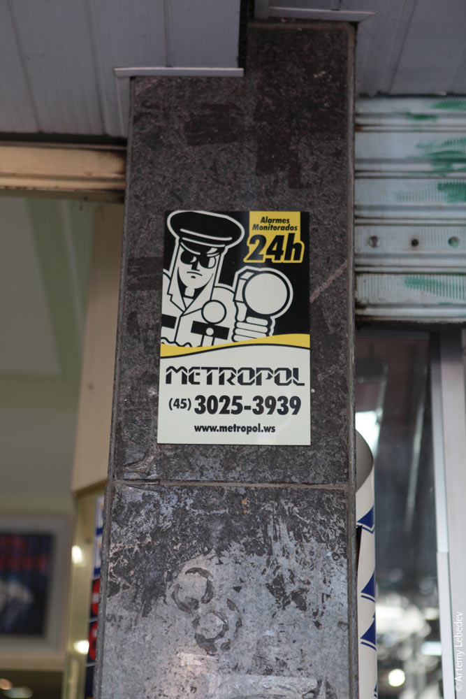 Бразилия. Часть I. Фос-ду-Игуасу — Сан-ПаулуНа карте мира7–10 января 2009 Мое путешествие по Бразилии прошло в южной части страны, где не Амазонка, первобытные племена и джунгли, а основные города. Бразилия оказалась на удивление развитой, полноценной и спокойной страной. Больше всего Бразилия похожа на США — схожие градостроительные идеи, дорожные знаки, любовь к большому количеству информационного текста. Больше всего меня поразило тут то, что практически все города одинаковы и скучны, совершенно как в Штатах. Бразильцы выглядят и ведут себя абсолютно спокойно. Но как только раздается музыка или звучат барабаны, люди буквально преображаются. Как музыка заканчивается, все возвращаются к размеренной жизни. Хотя мой рассказ идет в хронологическом порядке и разбит на города, почти все детали не имеют никакой привязки к местности — их можно встретить везде. ![]() Фос-ду-ИгуасуНа карте мираГород расположен в месте, где граничат три страны — Бразилия, Парагвай и Аргентина. Заодно тут же расположены водопады Игуасу, ради которых прилетают толпы туристов. ![]() Ну а где водопады, там и ГЭС, без этого никак (ср. отчет про Ниагара-Фолс). Тут туристов встречает девушка с опорой ЛЭП и юноша с трансформатором на головах. ![]() В этой части страны встречаются светофоры особой системы. Два столбика из шести огней каждый расположены по краям, в центральной части внизу — один желтый. Красный свет состоит из двух огней — один постоянно горит внизу, второй медленно ползет вниз, как фигура в Тетрисе. Когда он доползет до конца, загорится ненадолго желтый. ![]() Потом так же начнет сообщать об оставшемся времени зеленый. ![]() Где-то впереди пешеходный переход. Опять взрослый держит младшего за локоть. Этот стандарт распространился и на все соседние страны. ![]() Здесь тоже мусор возят на гужевом транспорте. ![]() Кстати, знак у любого кооператива — должен обыгрывать две елки (парагвайцы этот ход позаимствовали отсюда). ![]() Здесь борются с преступностью двумя способами. С одной стороны, просят преступников не появляться. ![]() С другой — грозят строгими и сильными полицейскими. ![]() Никогда бы не подумал, что тут я смогу пополнить свою коллекцию идиотских стоматологических иллюстраций. Зубная нить — мальчик и зуб-девочка, это так трогательно. ![]() Все телефонные будки одинаковые. Есть модель чуть постарше и чуть поновее (на фото: поновее). В каждом городе они различаются только цветами и логотипами телефонных компаний. Интересны местные урны для раздельного мусора. ![]() Сходство со Штатами местами просто поразительное, там тоже половина рекламных щитов держатся на деревянных столбах. ![]() На бразильском автомобильном номерном знаке указан город приписки. На номере сзади всегда висит пломба, на переднем номере ее почему-то нет. ![]() Тут я сел на самолет и полетел в Сан-Паулу. Сан-ПаулуНа карте мира