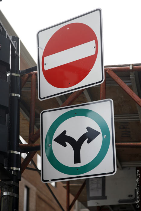 Но больше всего мне понравилось зеленое кольцо на знаках. Оно означает «проезд разрешен». У нас (и в Европе) бывает только красное кольцо, означающее, соответственно, «проезд запрещен»: одинокое (проезд в принципе запрещен) или с объектом в центре (чему именно проезд запрещен). А тут оно зеленое. Жаль, что не все мои читатели порадуются вместе со мной. Вот комбинация, означающая «можно направо и налево, а прямо кирпич».