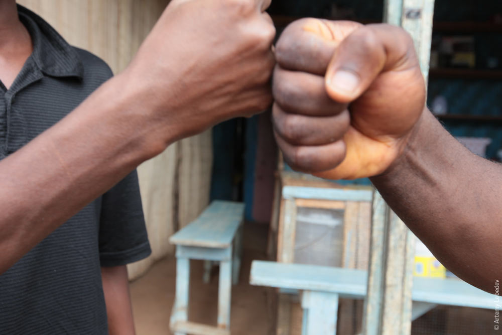 В Либерии существует особое либерийское рукопожатие. Сначала просто один раз пожимают руки. ![]() Потом пожимают руки в верхнем регистре. ![]() Потом снова обычным образом пожимают. ![]() Потом происходит самое невероятное — встретившиеся щелкают пальцами, отталкиваясь от пальца того, с кем здороваются. ![]() В конце нежно стукаются кулаками. ![]() Можно пропустить начальную и конечную фазы, но взаимное щелканье пальцев почти обязательно. Если нет на это времени, пожимают руки и разнимают их, продолжая нежно соприкасаться средними пальцами. Примерно так здороваются, в моем представлении, представители нетрадиционных сексуальных ориентаций. Тут это означает лишь то, что ты знаком с национальным обычаем. Главный элемент архитектурного украшения — фигурные дырки в бетонных заборах и окнах. И красиво, и воздух свежий поступает. ![]() В быту главный красивый объект — пластмассовый таз или ведро. Одноцветных не бывает, только с фигурными впрысками пластмассы другого цвета. ![]() Весьма распространены пластмассовые стулья с надписью на спинке «благослови тебя господь». ![]() Рассказ о красоте будет неполным без упоминания памятников. Одноцветные скульптуры не котируются, человек на памятнике всегда должен быть раскрашен или покрашен. ![]() Либерийцы не понимают, зачем нужны веревки для сушки белья. Все сушится прямо на траве или выкладывается на крышу. ![]() Подпорки в процессе строительства. ![]() Окна в маршрутном такси. ![]() Утюги используются самые современные — на углях. ![]() Стиральная машина последней модели. ![]() Дело в том, что в Либерии нет ни одной нормальной электростанции. Может, когда-нибудь и было что-то, судя по заросшим опорам ЛЭП. ![]() Но сегодня используются индивидуальные генераторы. ![]() Разумеется, генератор есть не у всех. Многим он просто не по карману. Зато у каждого есть мобила. Что же делать тем, у кого есть мобила, но нет генератора? Да элементарно — нужно отнести мобилу в заряжальный киоск, где дадут квиточек на время, пока трубка заряжается. ![]() На бензоколонке. ![]() Дорожные знаки — американские. Встречаются нечасто. ![]() Уличные указатели. ![]() В стране примерно три светофора, и все не работают. ![]() Телефонная будка. ![]() Столичная урна. ![]() Гидрант. ![]() Водонапорная колонка. ![]() Сотрудник почты намазывает марки клеевым карандашом перед тем, как налепить их на открытку (хотя на марках есть клеевой слой). ![]() Опускать весточку в единственный уличный почтовый ящик (типичной американской модели) смысла нет — все равно никто его не проверяет (как в Армении). ![]() Торговля кинофильмами. ![]() Торговля какими-то мясопродуктами. ![]() Торговля порционным майонезом. Владелец магазина прикрутил ложку скотчем к карандашу, зачерпывает порцию из банки, кладет в полиэтиленовый мешочек, делает узел, кладет вторую порцию, делает еще один узел и потом продает по пять копеек. У этого мужика еще и хлор продается в таких же порциях. ![]() Торговля диванами. ![]() Торговля свежеубитым сурком. За десять долларов продавец обещает подать жареным. ![]() Такси. ![]() Реклама народной медицины в иллюстрированных симптомах. ![]() Компьютеризированные способы нанесения единичных изображений пока не открыты в Либерии. Поэтому все рисуется руками. ![]() У любой лавки что-нибудь да нарисовано. ![]() Барак Обама очень популярен в образах и товарах — все-таки, тоже черный. ![]()
