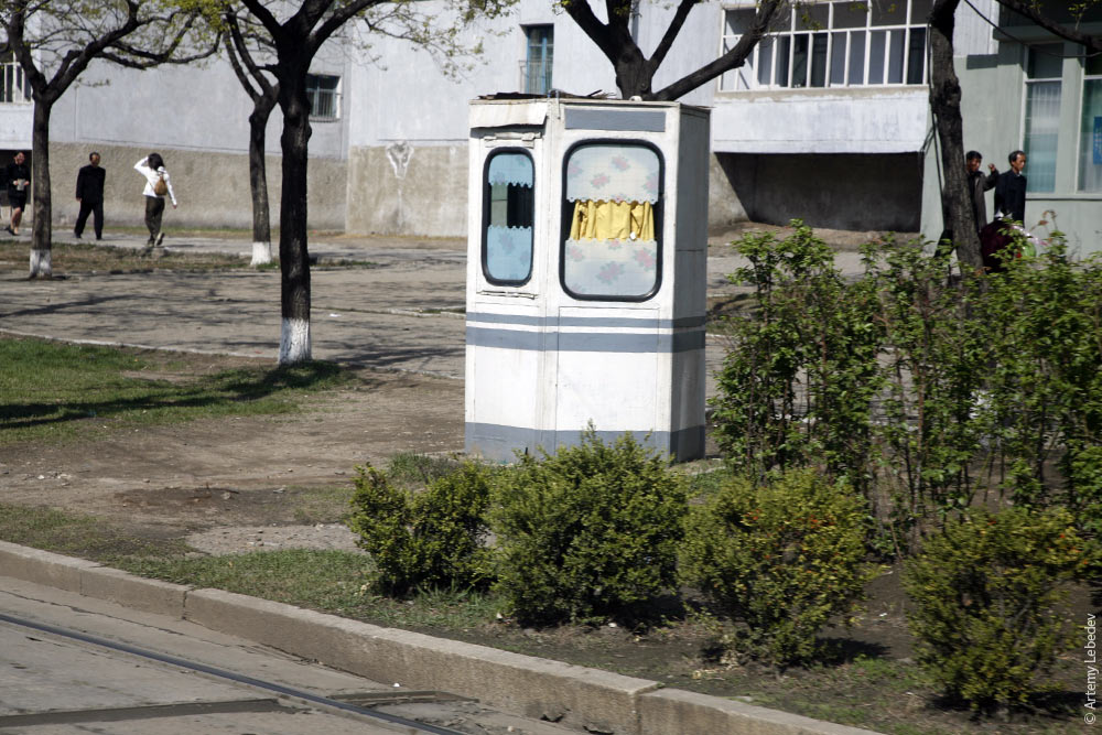 Города отличаются практически полным отсутствием автомобилей. Все ходят пешком («очень полезно каждый день гулять ![]() В Пхеньяне много подземных переходов, все играют в аккуратность — за переход проезжей части в неположенном месте штрафуют. При том, что обычно дорога выглядит так: ![]() Пешеходная зебра имеет оригинальный дизайн — две полоски, перерыв, еще две полоски, маленький перерыв, посреди дороги три полоски, потом симметричный повтор. ![]() Будка регулировщика. Или какого-то еще придорожного смотрителя. ![]() Дорожные знаки предупреждают водителей о наличии зебры синим знаком с пешеходом, перед которым заранее ставится еще и желтый знак, предупреждающий о синем. ![]() При этом водители совершенно никогда не останавливаются перед пешеходами. Подъезжая к переходу, водитель начинает интенсивно гудеть, разгоняя толпу как стадо коров. Гид не могла мне объяснить такого отношения. Она не знает, как объяснить, что у людей отсутствуют рефлексы, связанные с реакцией на гул мотора. И не знает, что пешеходам можно иногда уступать. В городе пешеходов заставляют ходить по дорожкам и пользоваться зебрами. А в селах все идут по дороге так, как будто машин тут вообще не бывает: ![]() У водителей, в свою очередь, отсутствует привычка смотреть в зеркала заднего вида — обычно там никого нет. Поэтому когда одна машина хочет обогнать другую, она начинает интенсивно бибикать — иначе водитель спереди ничего не заметит (справедливости ради надо сказать, что в Китае — то же самое). Машин так мало, что в Пхеньяне стала возможной мечта градостроителей — трамвай вдоль тротуаров, а не посреди дороги. У тротуара никто не паркуется, поэтому трамвай едет спокойно. ![]() Автомобильные развязки встречаются иногда в совершенно непредсказуемых местах. Вот эта, например, находится посреди ровного поля (хотя и проходит над железной дорогой): ![]() Единственный указатель на заправку находился рядом с моей гостиницей в Пхеньяне. А в городе Вонсане водитель даже заехал заправиться. Бензоколонка находилась за каким-то совершенно неприметным забором. С дороги точно не догадаешься. Перед въездом на заправку все пассажиры должны выйти из машины. В этом месте я понял, зачем перед некоторыми заправками у нас иногда висят таблички «обязательная высадка пассажиров» (см. рассказ про Пермь). В Северной Корее обязательная означает обязательная. Вдоль дорог установлены скульптурные композиции, призывающие к безаварийной езде: ![]() Остановка. ![]() Дважды в день на остановках выстраиваются очереди из тех, кому идти домой или на работу больше получаса (кому меньше — идут пешком). ![]() В Северной Корее не существует свободного перемещения автомобилей и людей — каждый человек привязан к своему городу. Чтобы поехать в другое место, нужно оформлять что-то типа командировки. Поэтому на всех дорогах стоят КПП. Контрольно-пропускные пункты оборудованы воротами на колесиках. Мой водитель начинал заранее гудеть и мигать фарами солдату, чтобы тот откатил ворота. По всей видимости, фарами на КПП мигают, когда в машине иностранец, чтобы не смущать гостя процедурами формальных проверок. ![]() Светофоры в городе встречаются, но не работают. ![]() Единственный работающий светофор установлен напротив входа в мавзолей Ким Ир Сена. В остальных случаях с немногочисленными машинами справляются в столице — регу